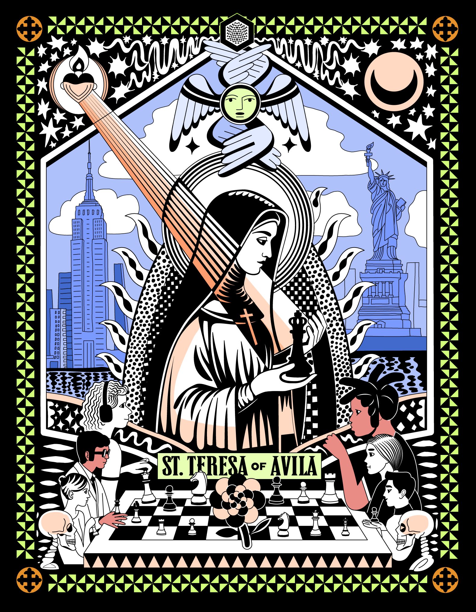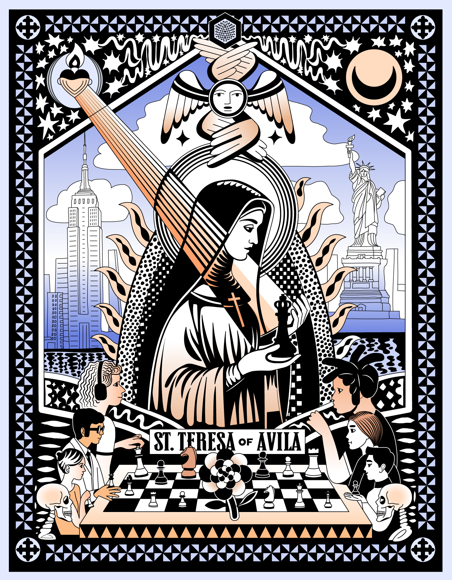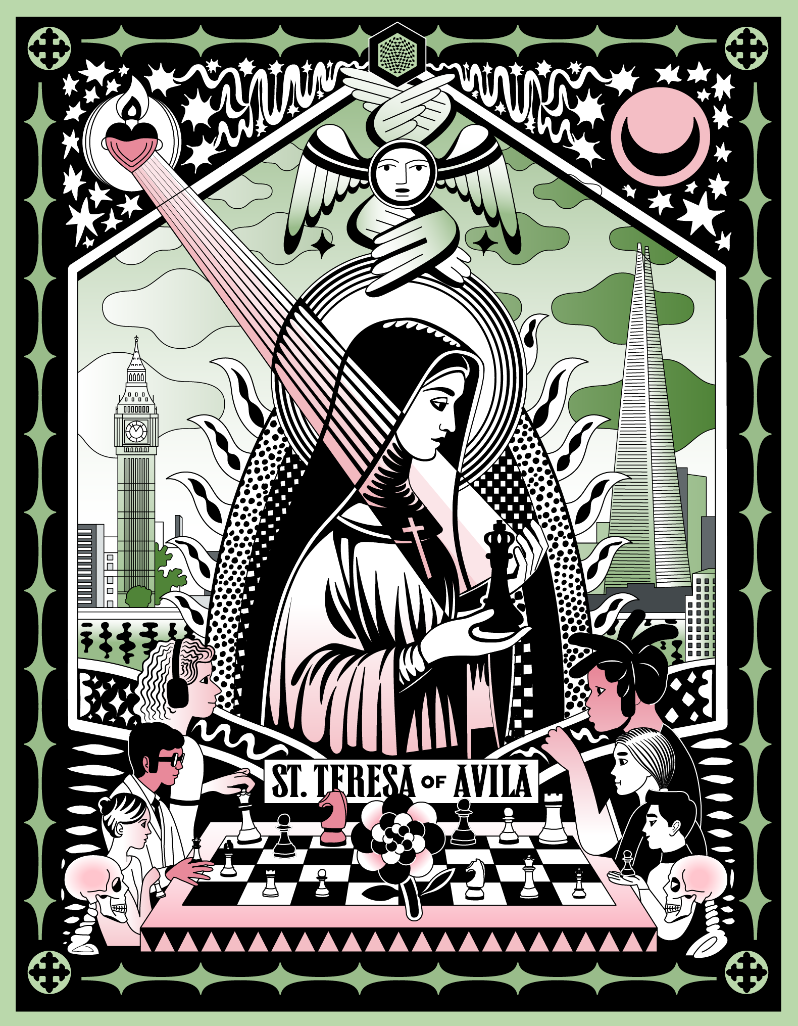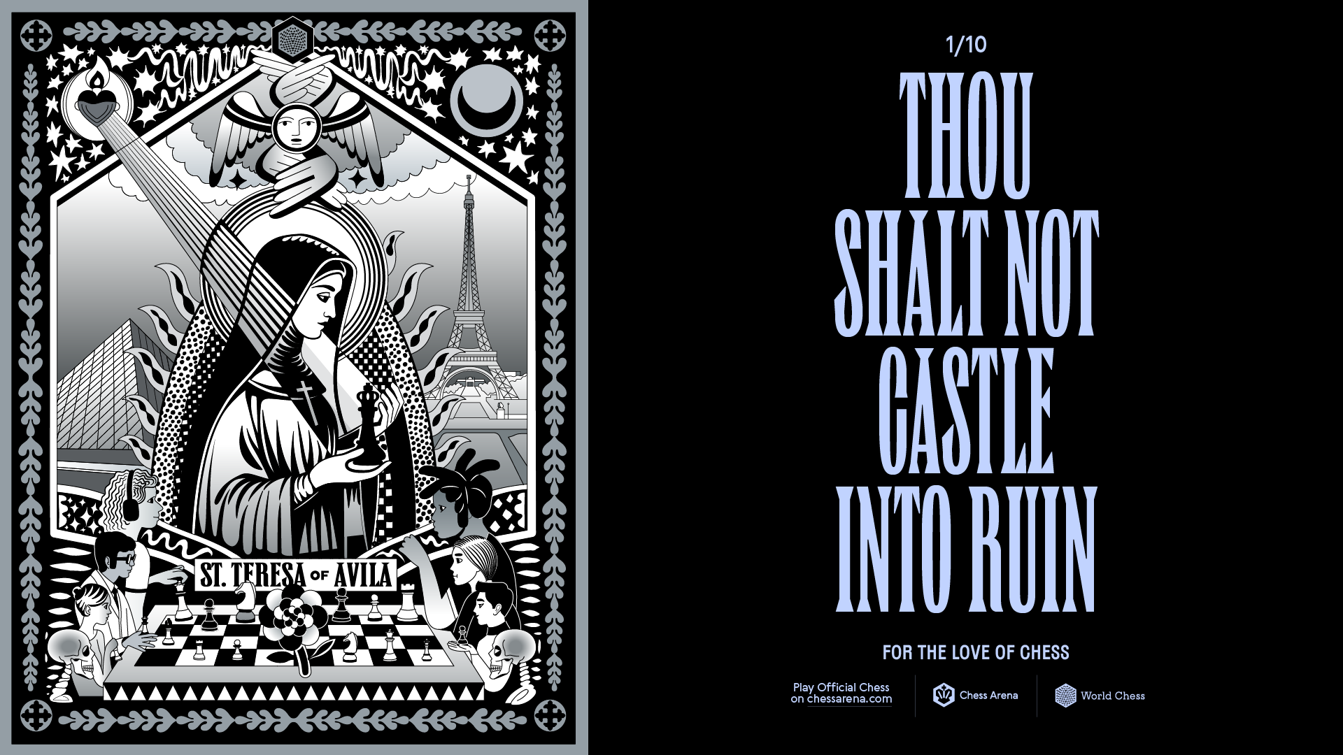 We wanted to change that. In 2025, with the Catholic Church’s blessing, World Chess re-recognized Saint Teresa of Ávila as the patron saint of the game. Teresa, the 16th-century mystic who once likened the spiritual struggle to a chess match, now appears in an icon we created: standing beside the board, children holding the king, with the commandment etched below — “Thou shall not castle into ruin.”